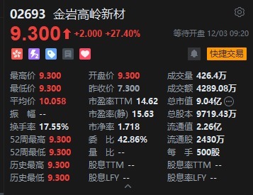 金岩高岭新材今日正式在港交所主板挂牌上市成都赚配网成都赚配网,首日表现强劲。该股开盘报9.3港元成都赚配网,较发行价7.30港元上涨27.4%。不计手续费,每手500股可盈利1000港元。